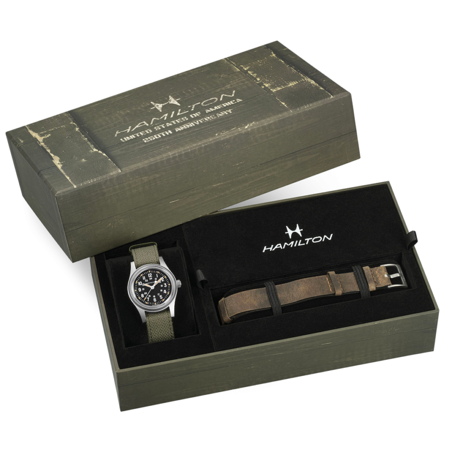 1970年頃、アメリカ空軍の隊員に支給されたナビゲーターズウォッチ「ハミルトン FAPD 5101」に着想を得た「カーキ フィールド メカ 36mm ジャパン エディション」は、真のミリタリーツールならではの堅牢でシンプルな魅力を現代に蘇らせています。マット仕上げのケース、固定式バー、アクリル製のボックス型風防、そしてカーキのコットン製NATOストラップはオリジナルの風合いを再現し、さらにスーパールミノバ® グレード X2と防塵カバーが組み合わされています。2026年のアメリカの建国250年に合わせて1,000本限定で生産されたこの特別モデルは、耐久性に優れたレザーストラップが1本付属し、バンドルパッケージに収められています。ハミルトンのミリタリーウォッチの伝統を称え、実用性を追求した本格的なディテールが随所に施されています。