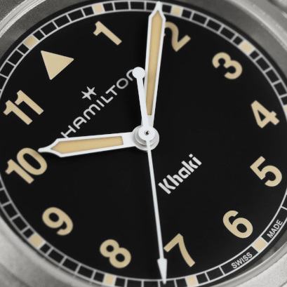 デザインのシンプルさでハミルトンのミリタリーウォッチとしての歴史への回帰を表現する「カーキ フィールド クォーツ」。直線的なアラビア数字と「レイルウェイ」ミニッツトラックにより、ダイヤルにはすっきりとしたタイポグラフィが実現しています。カラーパレットは控えめで、オールドラジウムカラーのスーパールミノバ®加工を施したインデックスによって、洗練されたブラックダイヤルが強調されています。グリーンテキスタイルを使用したNATOストラップとブラウンのレザーループが付属し、次のアウトドアでの冒険にぴったりです。